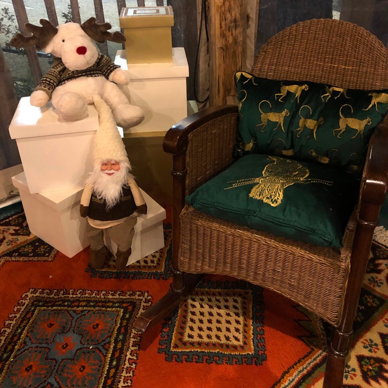 Agence de décoration événementielle à Lille et Paris, La Sceno vous propose à la location une chaise à bascule en rotin, pour vos décors de Noël ou de sport d'hiver.